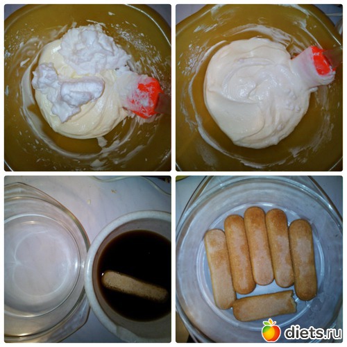 Затем в массу из желтков и сыра понемногу добавляем взбитые белки, аккуратно перемешиваем лопаткой, до однородности. Все нежнейший крем готов. В остывший кофе макаем печенья, по одному, прям на 1 секундочку (если дольше печенье сильно размокнет) и укладываем на дно форм, в котором будите подавать на стол (можно в порционные формочки, ).