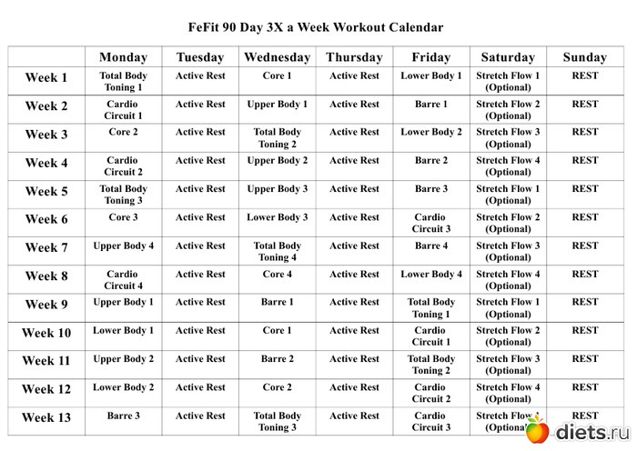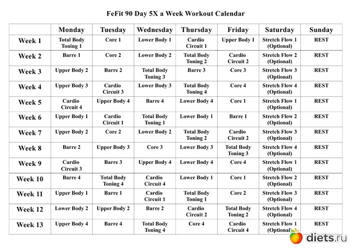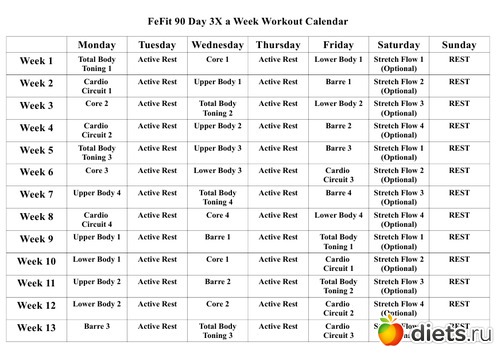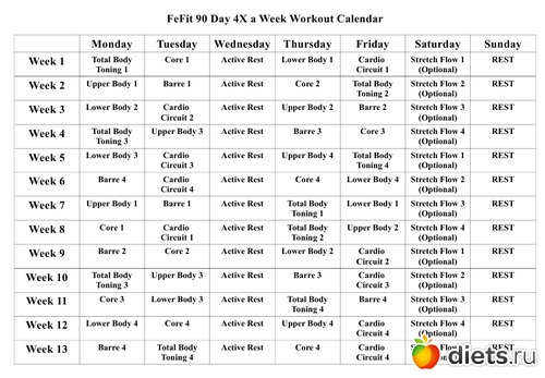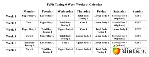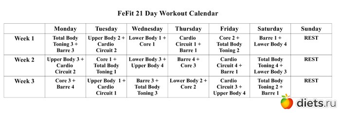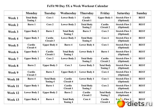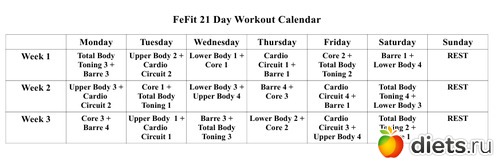 - во-первых, календарь-график занятий, вернее, даже несколько - для режимов - 3,4,5 и 6 занятий в неделю ( причем последнее - в двух вариантах - для тонуса и для похудения) + интенсив на 21 день
