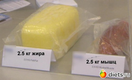 Это все глупости, у них приблизительно одинаковый объем, вопрос в том как мышцы и жир распределяются на теле. Мышечный рельеф выглядит более привлекательно, чем складки жира.