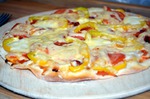 Далее выкладываем остальную начинку - тонко порезанные помидор, перец. Толщина колбасы - почти прозрачная. Она не нужна в пицце для нажористости. Она нужна для того, чтобы придать вкус копченостей.