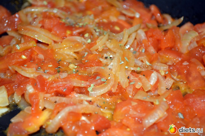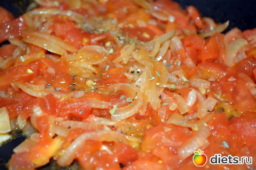 На горячую сковороду налить оливковое масло. Выложить лук. Обжарить для прозрачности. Если масла недостаточно, то добавьте воду. Следом выложите помидор. Перемешайте. Тушите на небольшом огне. Минут через 7-10 добавьте орегано, а по-простому - душицу. Не переборщите с этой травкой. Даже небольшое ее количество даст очень яркий вкус. посолите.