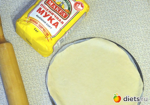 Из теста раскатываем круг диаметром 24 см. Тонко. примерно 2-4 мм толщиной. Выкладываем на лист для выпечки. Если лист не антипригарный - обязательно застелите его бумагой или ковриком для выпечки.