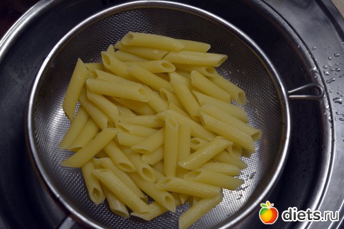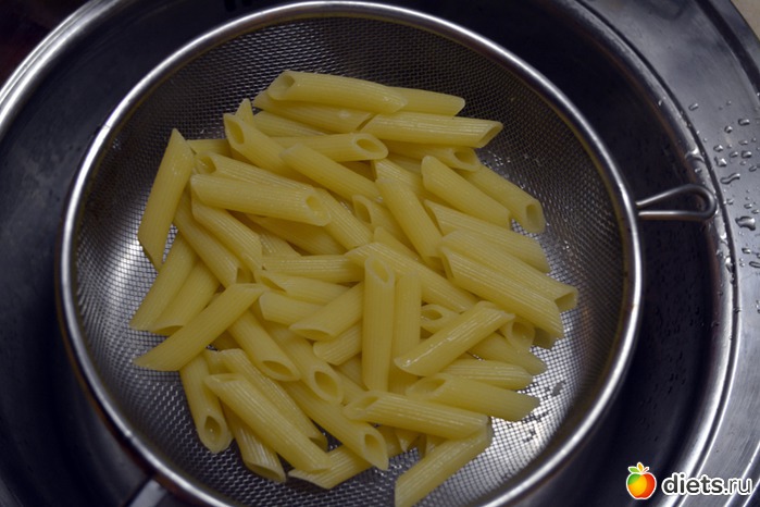 Макароны отварить в подсоленной воде. Именно эти макароны нужно варить 6 минут для этого блюда. Откинуть на дуршлаг, не промывать! Макароны из твердых сортов в этом не нуждаются.