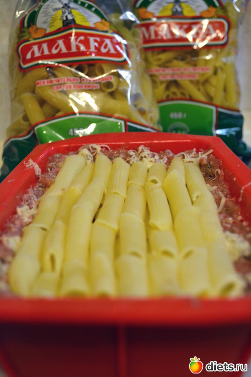 Макароны выложить в несколько слоев.