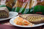 Нарезать "кекс" на порции. подавать с овощным салатом и соусами.