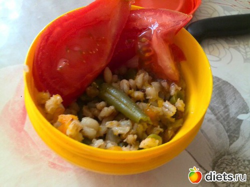 В перекусе была пара клюквенных хлебцев с яблоком, а потом любимая перловка с тыквой и стручковой фасолью, с добавлением кунжутного масла.