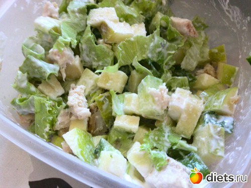 И на ужин (ужин был поздним) - салат из яблока, салата, огурца и куриной грудки со сметаной и семечками.
