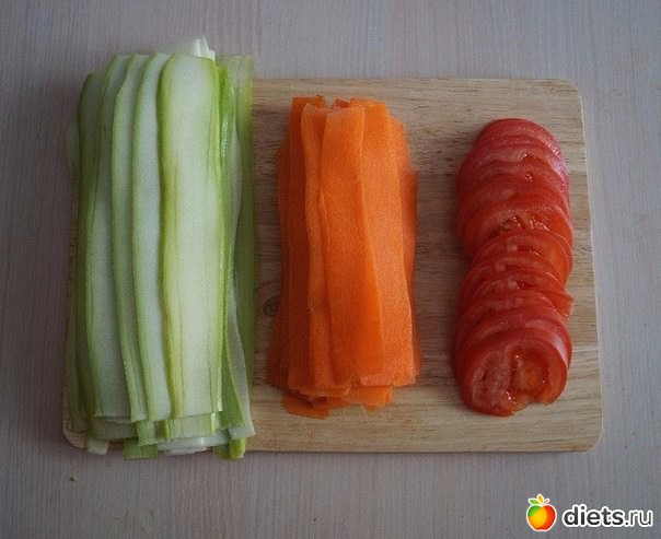 Кабачок и морковь нарезать тонкими полосками при помощи овощечистки.