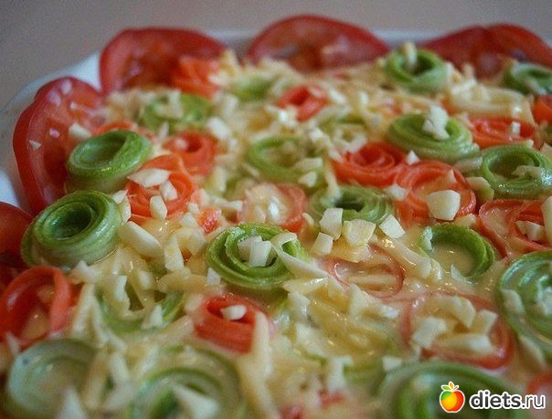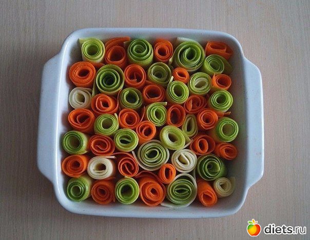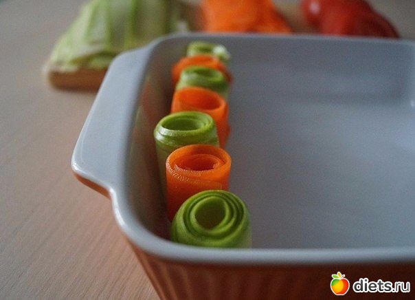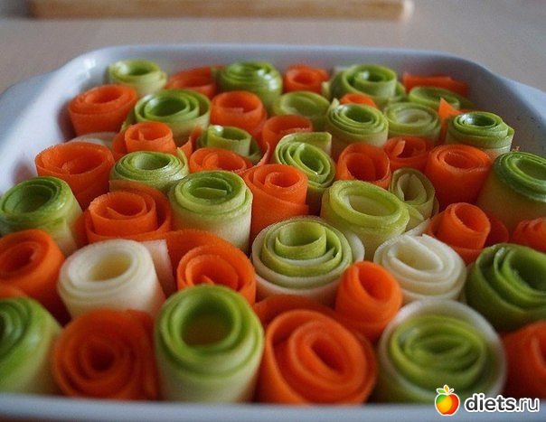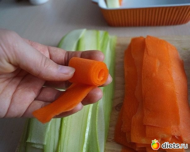 Каждую полосочку кабачка и моркови скрутить рулетом.