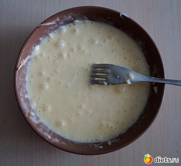 Приготовить заливку. Для этого взбить яйца, сметану, добавить соль и сыр.