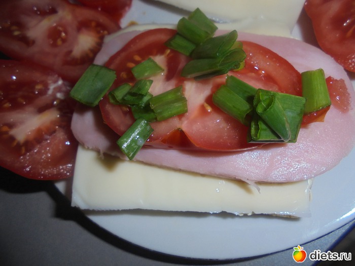 Затем томаты, подсолить. И посыпать зеленым луком.