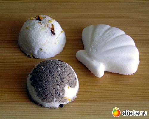 Иногда в качестве наполнителя бомбочек для ванной вместо соли для ванн используется тростниковый сахар (прекрасное средство для мягкого пилинга) или крахмал (смягчающий и питающий кожу).