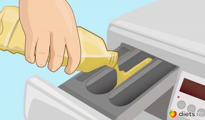 Уксус — отличный пятновыводитель. Обработай пятна от пота, жира, некоторых фруктов уксусом предварительно, а затем долей еще 50 мл в отсек стиральной машинки.