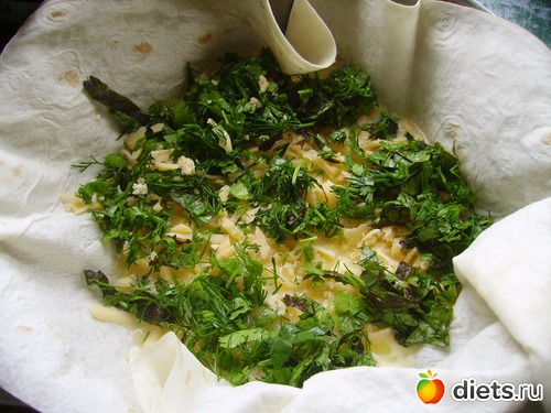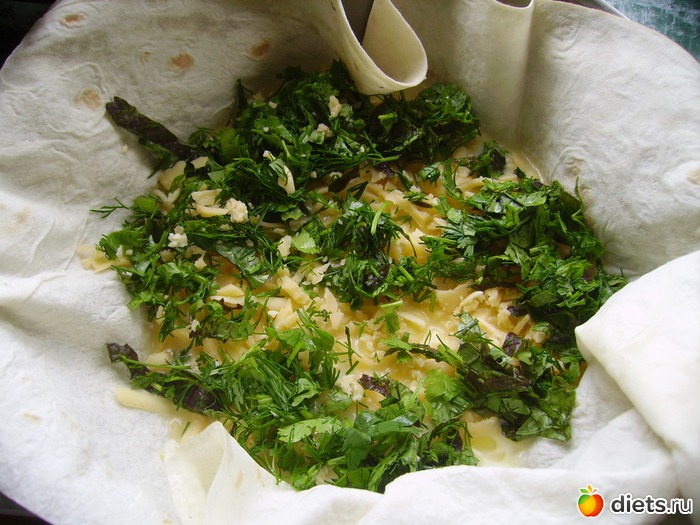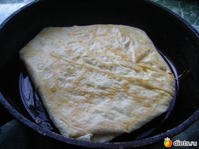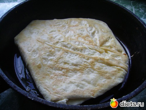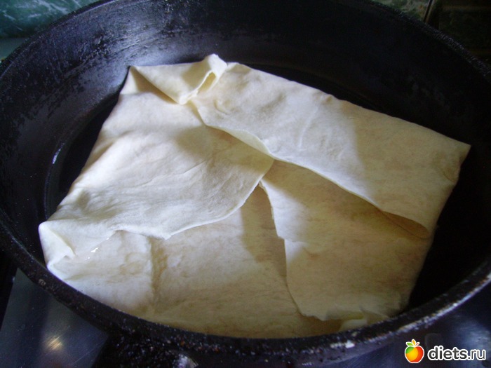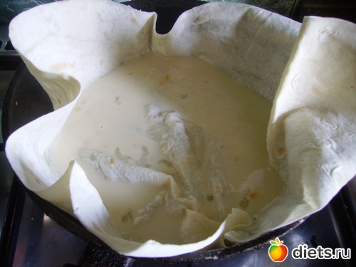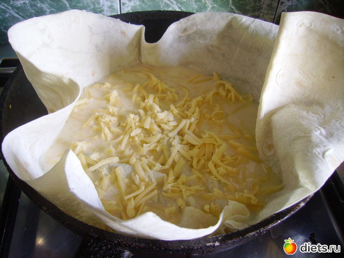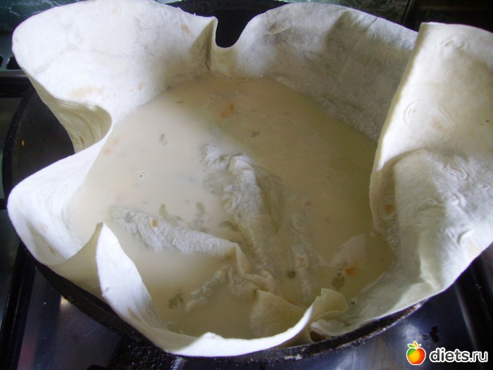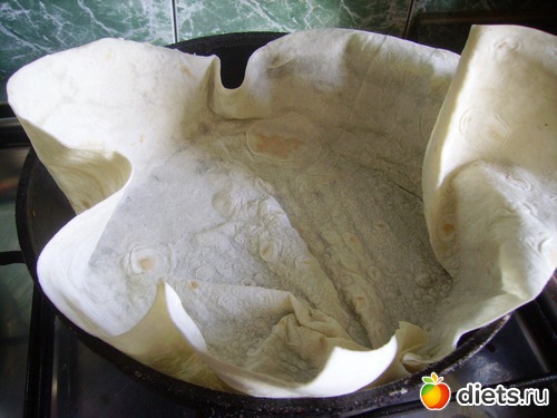 Приготовление: кусок лаваша раскладываем таким образом, чтобы края лаваша заходили за край сковороды и им можно было потом полностью закрыть начинку.