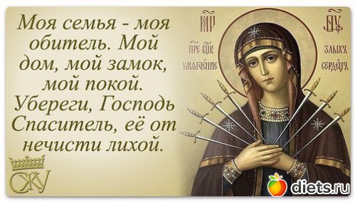 В молитве перед этим образом молятся об избавлении от жестокосердия, то есть о смягчении злых сердец, отсюда и название второго варианта иконы – «Умягчение злых сердец». В молитвах пред «Семистрельной» иконой речь идет об успокоении враждующих, о ниспослании им терпения, о прекращении вражды между близкими людьми и о рождении в душах людей чувства милосердия. Перед иконой Пресвятой Богородицы «Семистрельная» молятся, когда в жизни человека случается какой-либо разлад, ссора, начинается вражда. Она помогает помириться с родными, разрешить конфликт с близкими, улучшить отношения между супругами, а также детьми и родителями. Нося с нательным крестиком образ Семистрельной Богородицы, вы оберегаете себя от всех «дурных взглядов», сплетен, конфликтов, а кроме того, от собственного гнева и раздражительности, и прочих греховных мыслей. Ещё одна из особенностей: перед этой иконой в храме принято ставить не меньше семи свечей сразу. А дома размещают её зачастую не в домашнем иконостасе, а вешают над входом в главную комнату дома, чтобы Божья Матерь взирала на всех, кто входит в дом. Таким образом, Семистрельная Богородица защищает семью от посетителей с плохими намерениями и дурными, недобрыми мыслями. После того как повесите икону, можно увидеть, что некоторые люди перестали посещать ваш дом. Также, если вы надолго оставляете жилище, разместив в нем этот образ, можете быть уверены, что оно защищено от воров и преступников. Таким образом, Семистрельная Божья Матерь – это защита от всех недоброжелателей, которые могут навредить вашей семье. Эта старинная икона считается одной из самых сильных и заслуживает места в вашем доме.