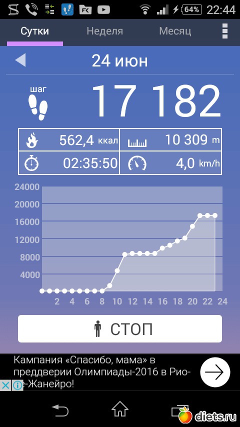 Так давай держись,ты вон молодчинка 17тыс.шагов прошла,я вчера то же 16)))хотя так было вообще не трудно,т.к.и с утра прошла,и в обед,и вечером.....постепенно и набралось.