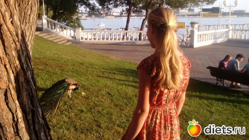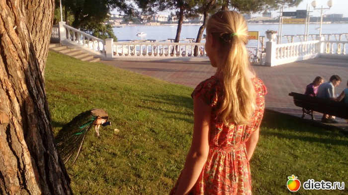 По пути увидели такую картину. Павлин ходит свободно по траве пасется, такой красивый ( хозяева, которые с ним фотографируют, отпустили его походить)