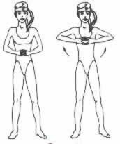 Начинаем занятие из той самой позы, которую вы освоили на подготовительном этапе: ноги расставлены, руки упираются чуть выше коленей, колени полусогнуты (рис.1). Делаем дыхательное упражнение, задерживаем дыхание, втягиваем живот. Из этой позы выпрямились и поставили ноги на ширине плеч. Руки поставили перед собой, округлили и замкнули. Соприкасаются только пальцы. Руки параллельны полу (рис. 2). Выполняете дыхание и на его задержке переходите к упражнению.