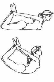 На задержке дыхания начинаем разгибать ноги в коленях, одновременно поднимая грудь и голову. Внимание! Стараемся как следует прогнуться в пояснице! Голову откидываем бедра отрываем от пола. Следите, чтобы тело касалось пола в районе пупка (рис. 5).