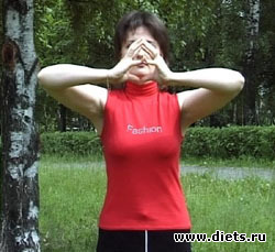 Начинайте давить пальцами друг на друга. Как можно сильнее давление! Руки не сдвигать! Давление только кончиками пальцев! Сохраняете давление на восемь счетов. Потом расслабились. Вернулись в исходное положение. Повторите задание 3 раза. Упражнение великолепно подкачивает мышцы рук, особенно с внутренней стороны предплечий. К мышцам направляется поток кислорода, который начинает сжигать избыточный жир. Для многих женщин бывает проблемой убрать жир и сделать руки красивыми и изящными. Нездоровая припухлость, отечность, плохая кожа - расплата за ожирение.