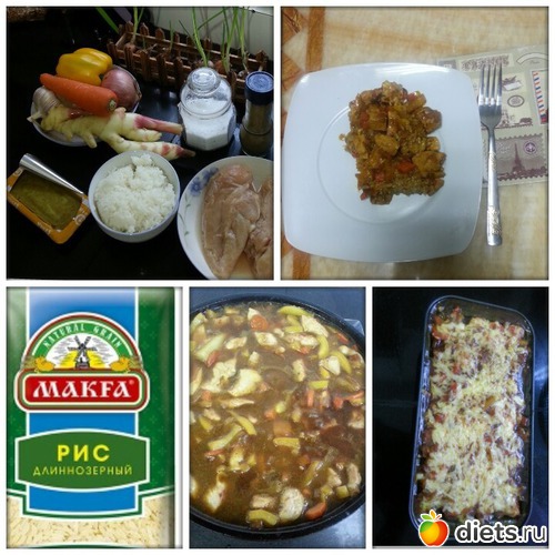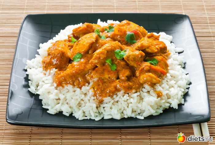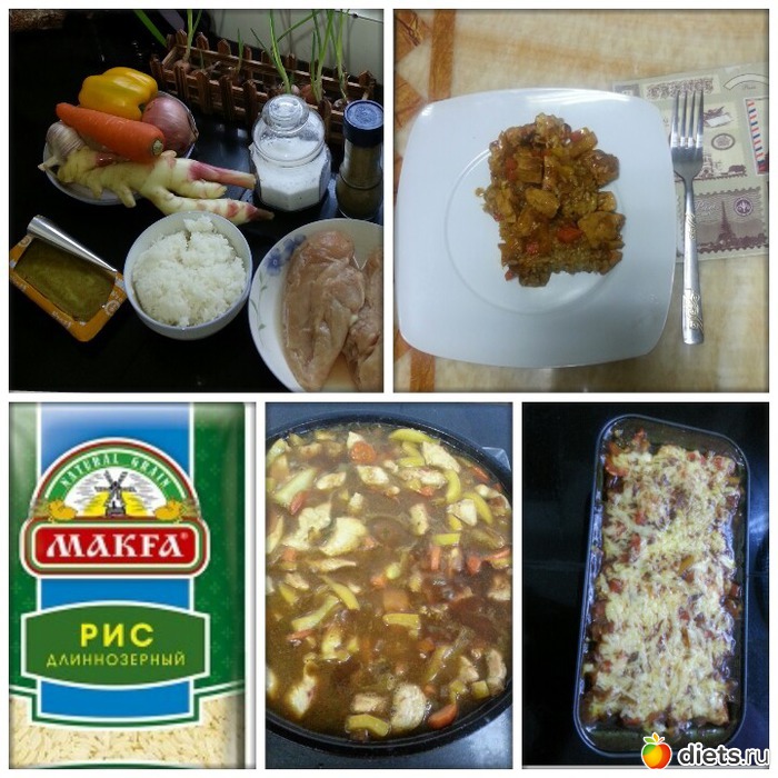 5) В форму кладем рис, сверху мясо с карри, засыпаем сыром и ставим в духовку на 10 минут. В классическом рецепте Гали Фань не добавляют сыр и не запекают, а подают рис и сверху или с боку кладут карри с курицей и овощами.