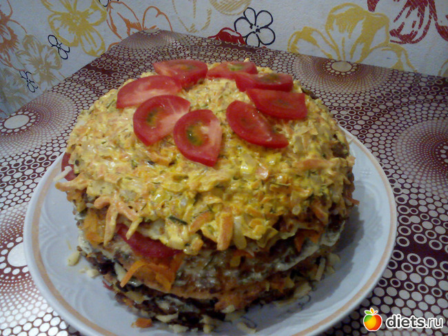 Пока жарится очередной корж, на готовый мы намазываем слой майонеза с чесноком и зеленью, выкладываем начинку из лука и моркови, разложить кружочки помидоров, посыпать тёртым сыром. Накрыть готовым, горячим коржом. Так повторить с каждым слоем! Сыр плавится от только что испечённого коржа и скрепляет тортик.