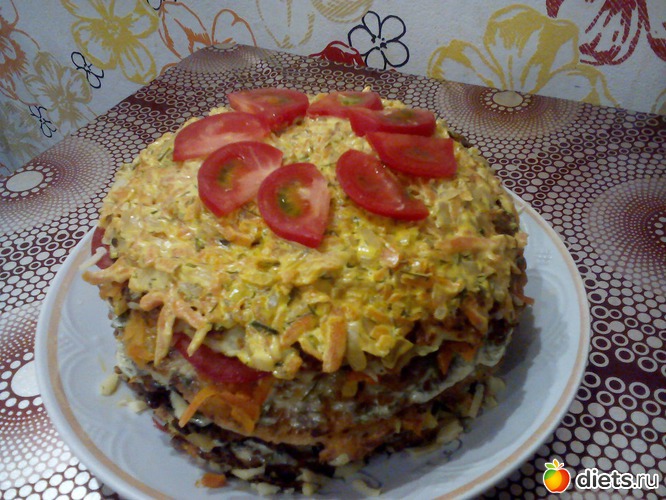Я внесла небольшие изменения-приготовила все под себя,но основа-Ваш пост.Я не добавляла помидоры,добавила, хорошо так, чесночка -на кабачковый блин и майонеза у меня ушло всего 59г.Я промазывала кисточкой силиконовой.В кабачковый блин я добавила немного сыворотки,яйца , муку,1/4ч.л.разрыхлителя.И пекла их толстенькими-но как овощные блины.