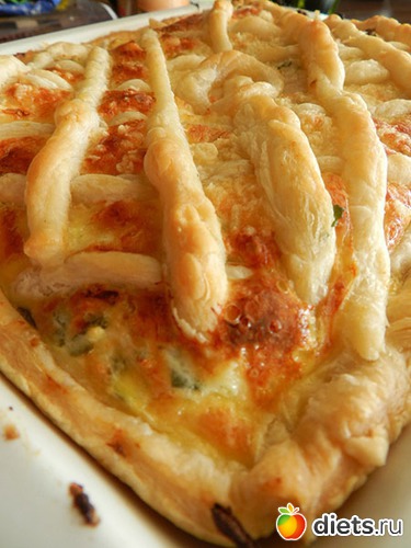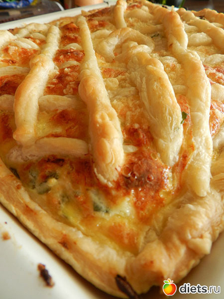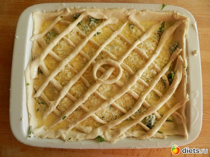 Посыпаем натёртым пармезаном. Из обрезков теста можно скатать колбаски и украсить пирог.