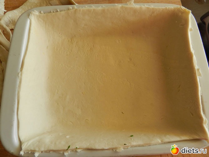 Раскатываем тесто. Выкладываем в форму, подрезав краешки по высоте бортиков формы.
