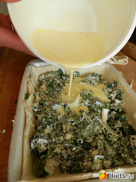 Выкладываем зелень в форму и заливаем яично-сливочной смесью.