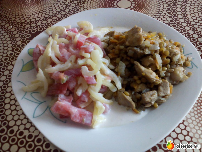 Обед - тушеная чечевица с курицей и овощами 200г + салат из помидора и перца, заправленный натуральным йогуртом 162г