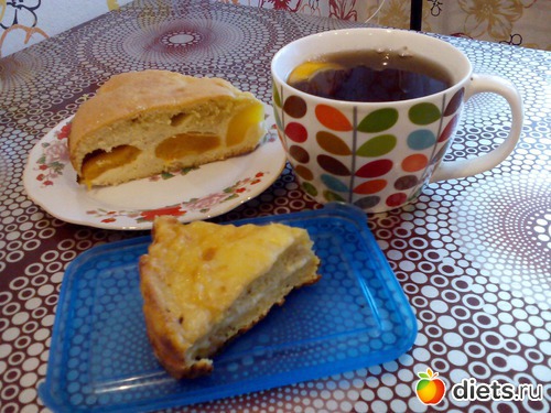 Завтрак 6:40 - творожно-сырный ПП пирог 81г, абрикосовый пирог 151г, чай с лимоном