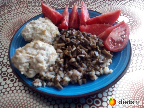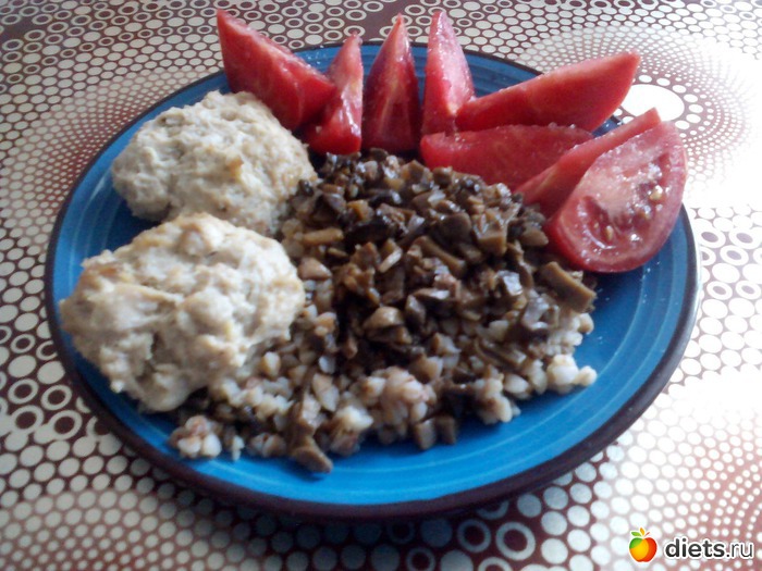 Обед - куриные биточки + гречка с тушеными грибами всего: 250г + 1 помидор