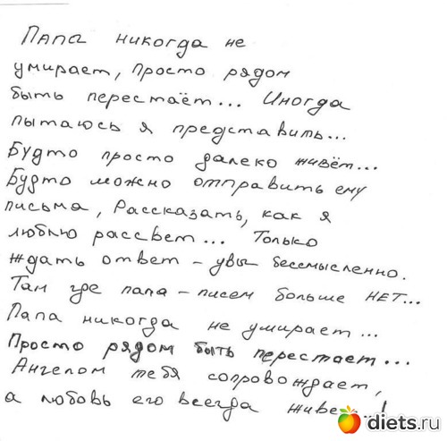 Здравствуй, папа, родной... как ты там?.. Самый любящий в мире мужчина.. Знаешь, если года посчитать, У тебя сейчас были б морщины... Я бы их целовала шутя Или ныла в рукав, когда плохо. Ты шепнул бы, что годы летят, Только я всё такая ж дурёха... Ты мне сниться совсем перестал. Не приходишь - скажи мне, так надо? С ливнем весточку дай - как ты там?.. -... [b][url=https://www.diets.ru/post/1641179/]Читать