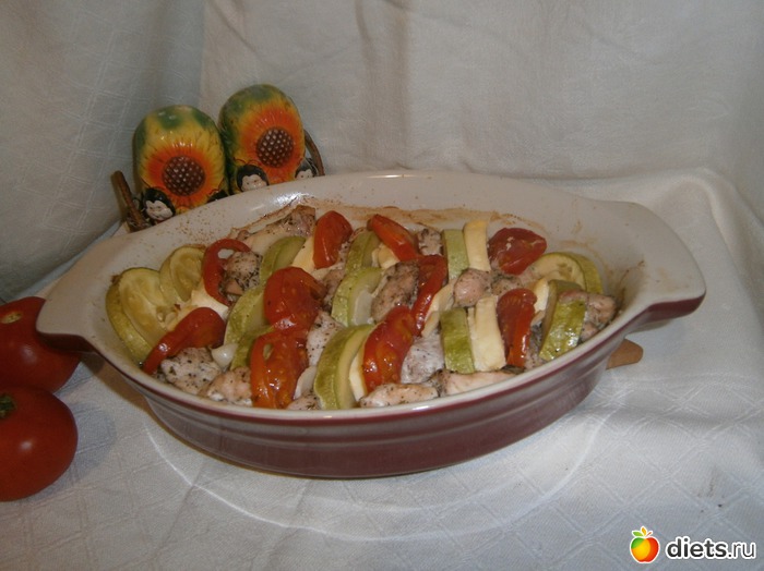 Куриное филе, запеченное с кабачком, помидором и сыром.