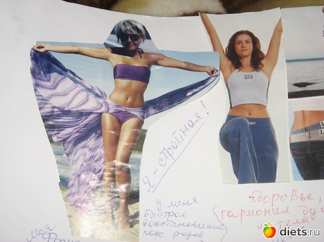 К этому можно подойти творчески - можно нарисовать себя-новую, можно сфотошопить, можно применить программку "Моя виртуальная модель" и самый простой вариант - на фото с идеальной фигурой приклеить свое лицо. Потом готовым образом любуемся ежедневно, воображаем!