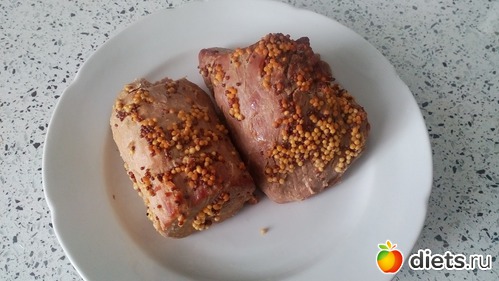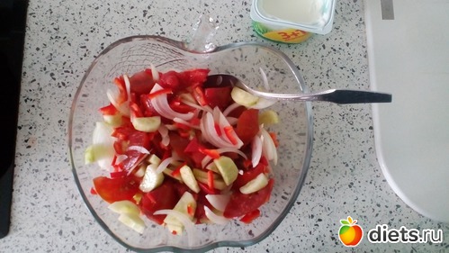 О - буженина замаринованная во французской горчице и запеч. в рукаве, салат из помидоров, огурцов, лука, перца и заправила активией;