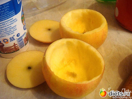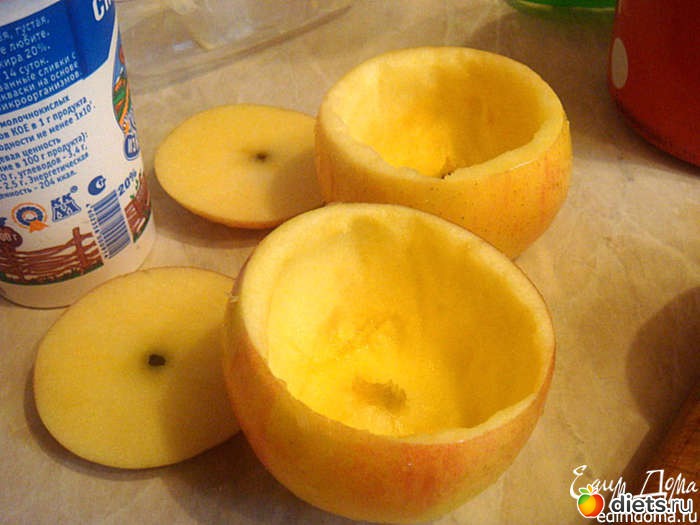 Включить духовку на 200*С. Теперь приступим к яблочкам: помыть, аккуратно срезать крышечку и вычистить сердцвеину яблочек, оставляя стенки и дно примерно по 5 мм (мякоть яблока не выкидывать!). Этот процесс у вас как-раз займет примерно 15 минут. Тем временем достаем курочку из холодильника - посмотрите, она впитала весь маринад!