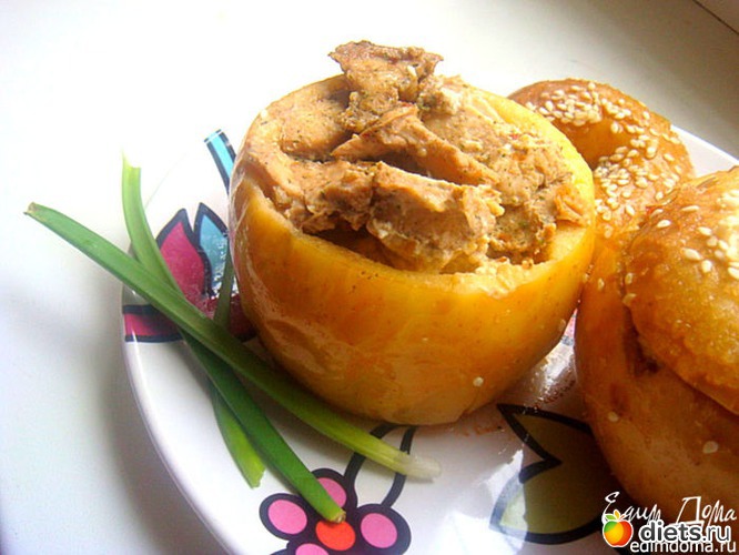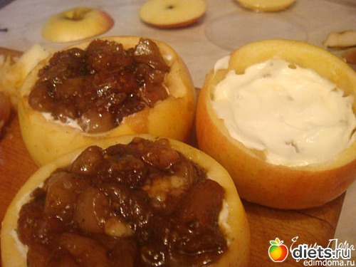 Теперь начиняем яблоки следующим образом - половину куицы распределяем по трем яблочкам, сверху по 1 ст.л. мякоти яблок, обмазать сверху сметаной и выложить в яблочки вторую часть курочки.