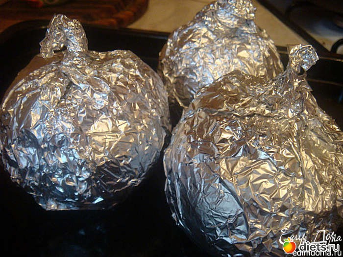 Закрываем яблочки крышечками. Заворачиваем каждое яблоко в фольгу и на противень- в духовку - запекаем 30 минут,