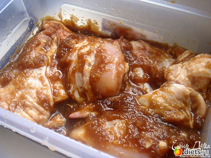 перемелите их в блендере в яблочное пюре, добавьте 1 ст.л. бальзамического уксуса, 1 ст.л. соевого соуса и прекрасный маринад для курочки готов. Обмажьте курочку (разделенную на куски - у меня 4 кусочка) этим маринадом и отправьте в холодильник минимум на 30 минут. Запекайте при температуре 190*С 30 минут! Прекрасная запеченная курочка под яблочным пюре-готова!
