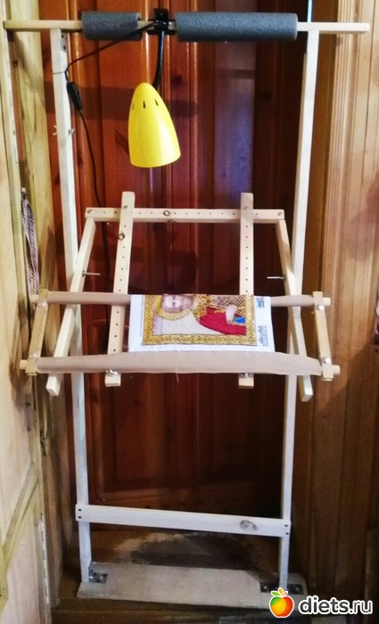 Продолжаю вышивать. Есть уже несколько готовых работ. Сыночек помогает. Нет, не вышивает. Делает станок для вышивания. Напольный. Один сделал. Немного коряво, но удобный. Сейчас усовершенствует. Я высказываю свои пожелания, он выполняет.