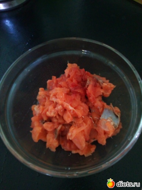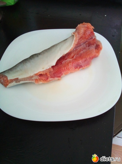 1 тушку свежемороженной горбуши освобождаем от костей, отрезаем голову и хвост. Затем с каждого филе снимаем аккуратно кожицу. У меня горбуша попалась суховатая, видимо перележала в магазине (муж покупал, что подсунули), но при этом шкурка снялась хорошо. Вот же пир моим кошкам был!