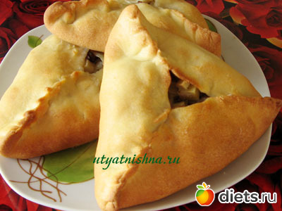 На середину лепешки кладем начинку и защипываем тесто с трех сторон придавая форму треугольника. В центре оставляем отверстие. Это отверстие нужно закрыть пробкой из теста.