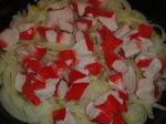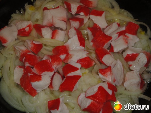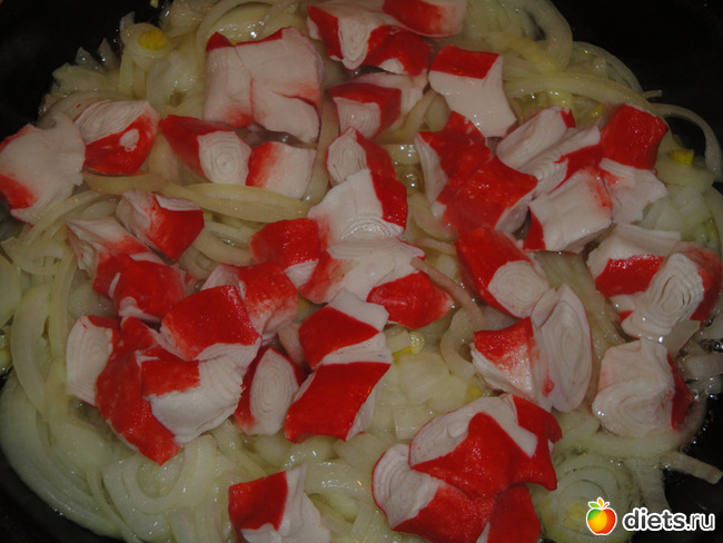 порезала полукольцами 2 большие луковицы.немного обжарила в большом кол-ве растит. масла.добавила 200 гр крабового мяса(палочек).потушила ещё немного.