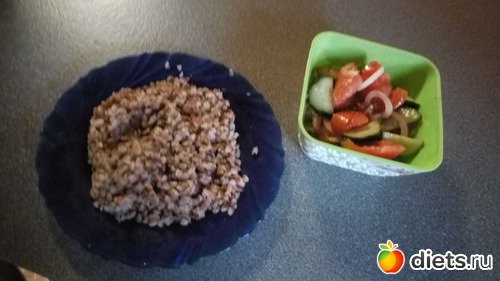 Ужин:гречка и овощи салатом(помидорами,огурец,лук,соль,перец)