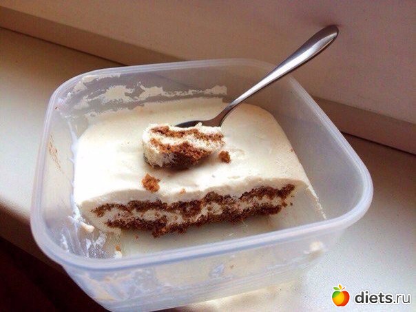 Остывший корж разрезаем на 4 части и укладываем в контейнер:корж, творожную массу, корж, творожную массу. Ставим в холодильник до застывания.(25-40 минут)