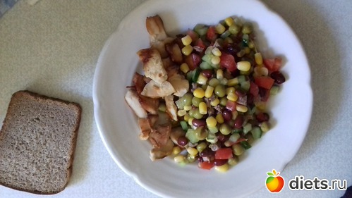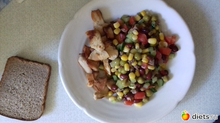 Второй завтрак: курица жареная без масла и салат: говядина, огурец, помидор, горошек, кукуруза, красная фасоль.