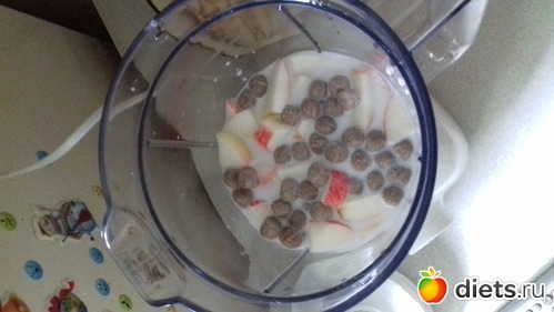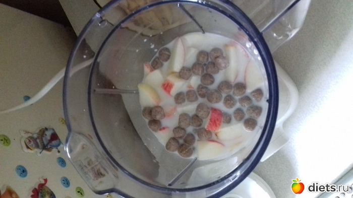 Смузи-полдник: йогурт без сахара и наполнителей, молоко, дыня, яблоко и ржаные отруби.