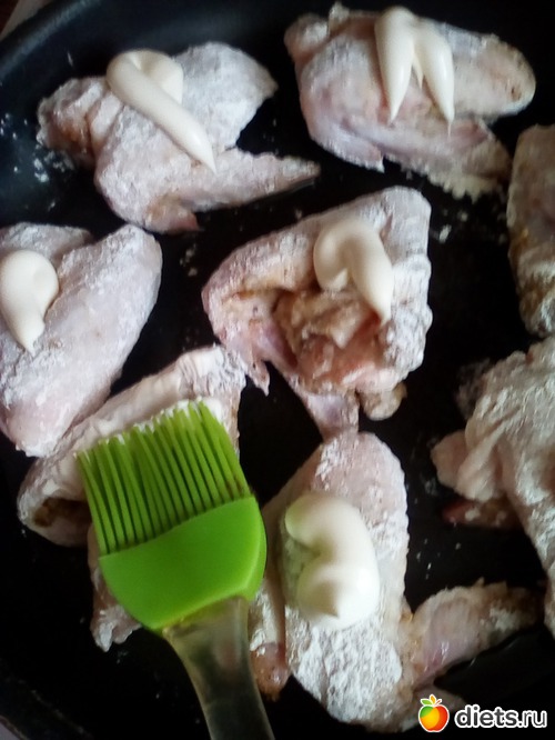 Протвинь(или сковороду, или форму) чуть смазать растительным маслом. Кладем наши кусочки на протвинь, не очень плотно. Поверх каждого кусочка капнуть немного майонеза и кисточкой(или ложкой)обмазать положенные кусочки с боков и сверху. Ставим в духовку и запекаем до подрумянивания.(В моей плите при 180градусах-30-35 минут).